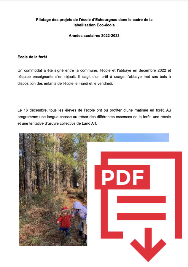 En 2023, l’association « Terres Productives ! Pour une agriculture belle et maintenue » a débuté un projet de Forêt Comestible Citoyenne sur un terrain communal jouxtant l’école. Les bénévoles de l’association ont dès le départ intégré l’école au projet pour initié les enfants à une forme de culture différente, l’agroforesterie, en animant des ateliers avec eux et surtout en leur faisant profiter des fruits de leur labeur.